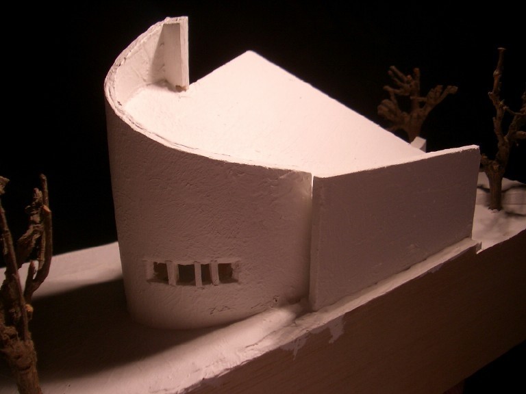 Nicht zuletzt deshalb, weil von der Ursprungskapelle, die vor ca. 150 Jahren abgerissen wurde, nur noch Grundmauersteine vorhanden sind, aber sonst keine Pläne oder detaillierte Ansichten. Unsere Architekten vollbrachten nun das Kunststück, auf einem „Handtuch“-Grundstück von 9 m Breite, schräg zu den Himmelsrichtungen positioniert und von der Fulda her stark ansteigend einen Entwurf zu entwickeln, der folgende wichtige Komponenten aufweist: